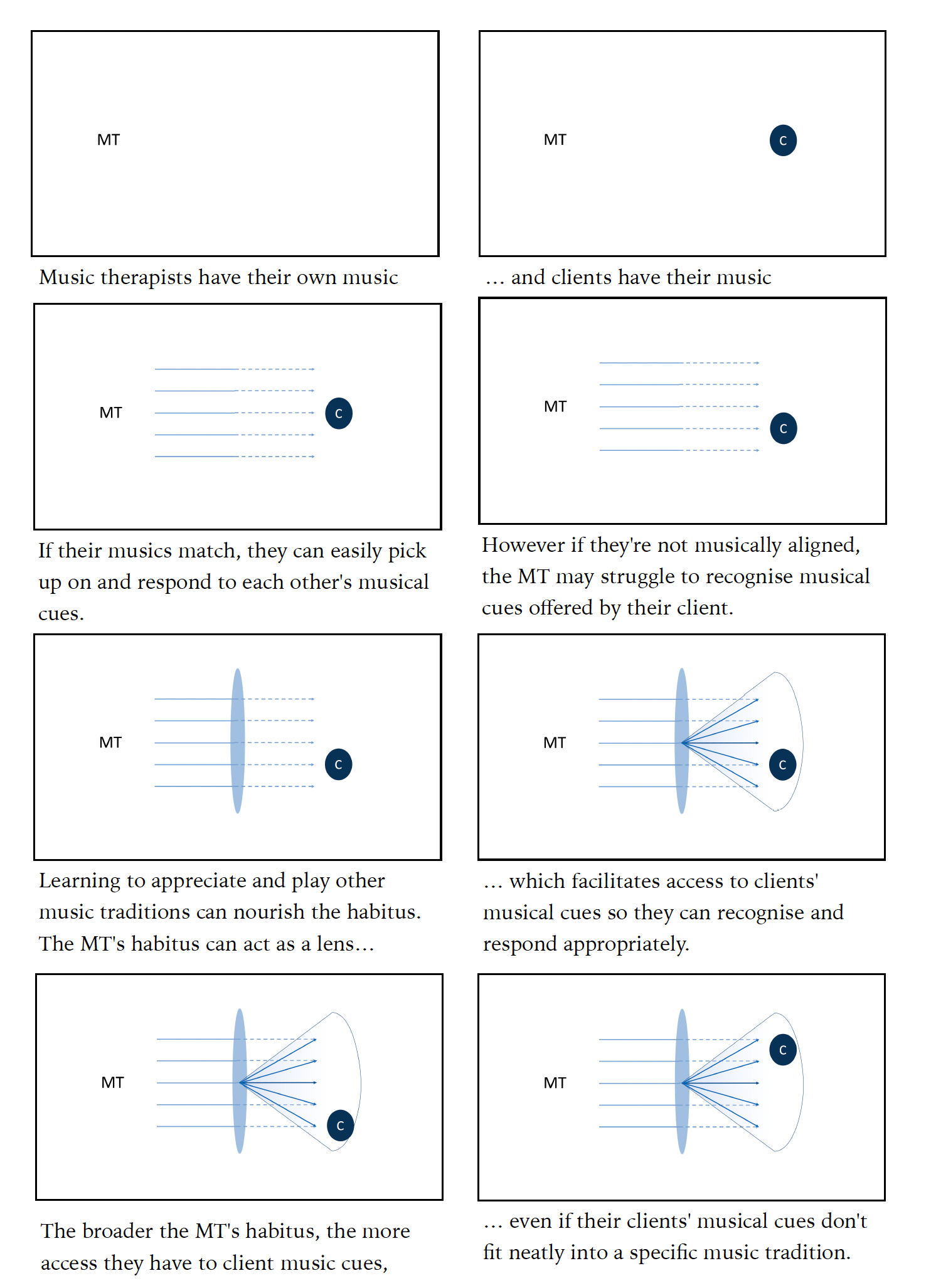 In music therapy, this could be considered to enable or inhibit access to therapy where a client may not be interested or have the musical experience to engage in the music of the therapist . Similarly, the therapist may not recognise potential musical cues from the client.