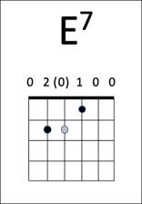 The greyed out note in this chord is an E, that is the 2nd fret on the D string. This E is not essential to the chord, as the chord shape features two other Es in the treble and bass on the open E strings. Lifting this finger lowers the note by two semitones to the open D string, transforming the E major chord into the dominant E7.