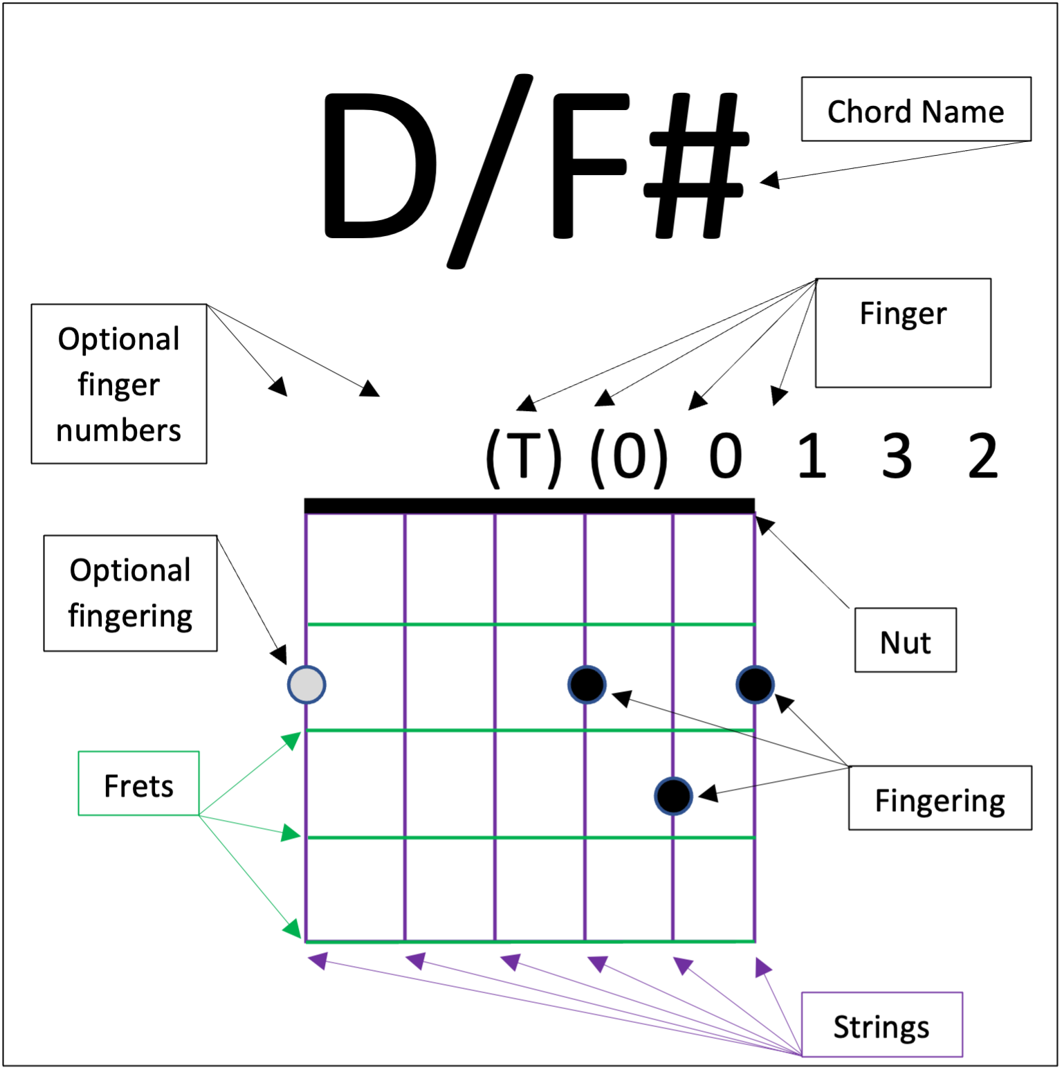 The heavy black line at the top of the grid represents the nut at the end of the fretboard. The nut is not included if the chord is voiced up the fretboard. Diagrams without a nut will include a fret number label to indicate where the voicing is situated on the fretboard. The grid represents the fretboard. For differentiation purposes in this diagram, the strings running parallel to the fretboard are purple and the frets running perpendicular to the fretboard are green. The fretboard will be monochrome in subsequent chord shape diagrams.