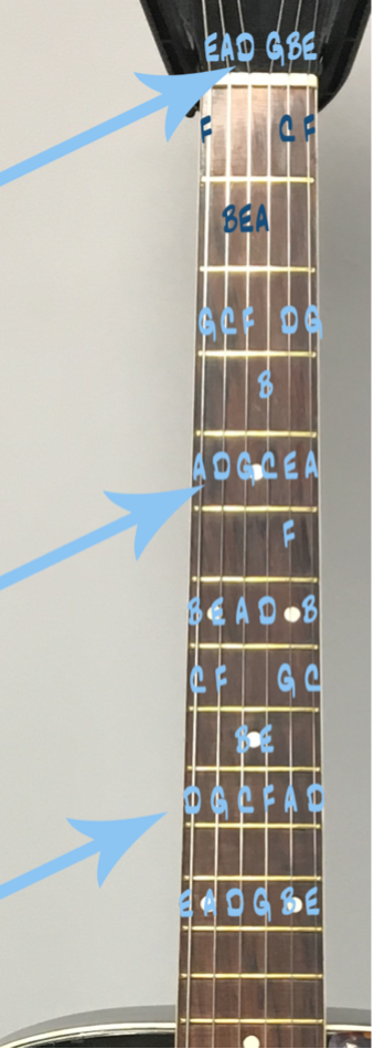 The annotated photo of a fretboard features the ‘white note’ letters to demonstrate this pattern all the way up the fretboard and was used as a reference point when participants wanted to modify a chord shape to fine-tune their voicing. To demonstrate the pattern of 4ths, D was marked with an arrow at the tenth fret on the 6th string E, 5th fret on the 5th string A and open on the 4th string D.