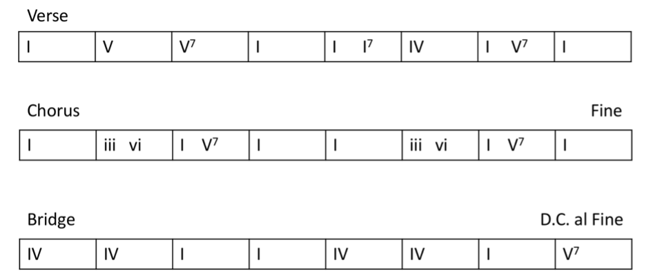 Lennon and McCartney’s Ob-la-di Ob-la Da typically features a bright bass line and a strong back beat. Using the slap strum pattern above play the chord progression below creates a similar bounce than instils momentum into the song. Participants were only supplied with the chord progression in Roman numerals to encourage harmonic independence and flexibility. The song was played in different keys at various points in the program as this type of flexibility is often required in music therapy applications.