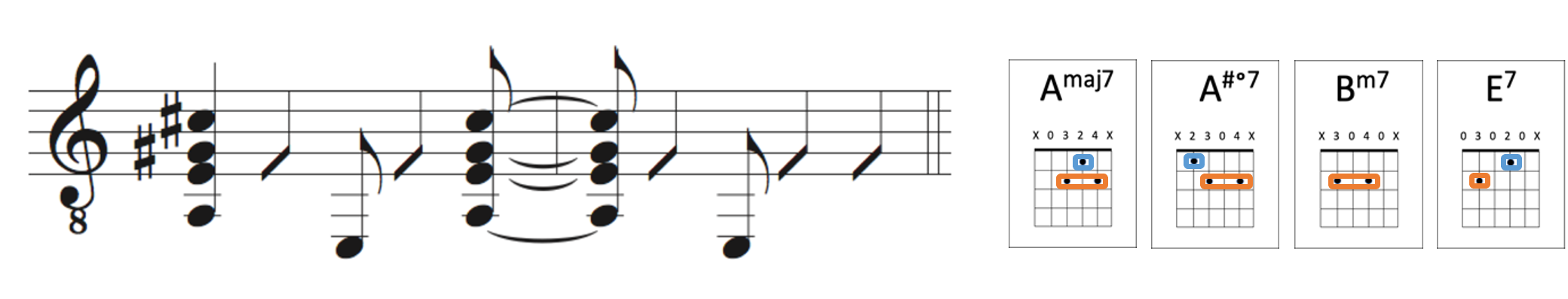 Bossa nova is a form of Brazilian jazz that features many layers to create an underlying syncopation. The pattern below features a rhythmic pattern that alternates between a bass line played by the thumb and triads played by fingers 1, 2 and 3. The understated syncopation in this pattern creates a sense of forward motion while maintaining a relaxed atmosphere. This rhythmic figure was applied the turnaround chord progression from the Pivot Fingers page and can be played either as one bar per chord, a four-bar phrase, or with each chord continuing for the full figure extending the phrase to eight bars.