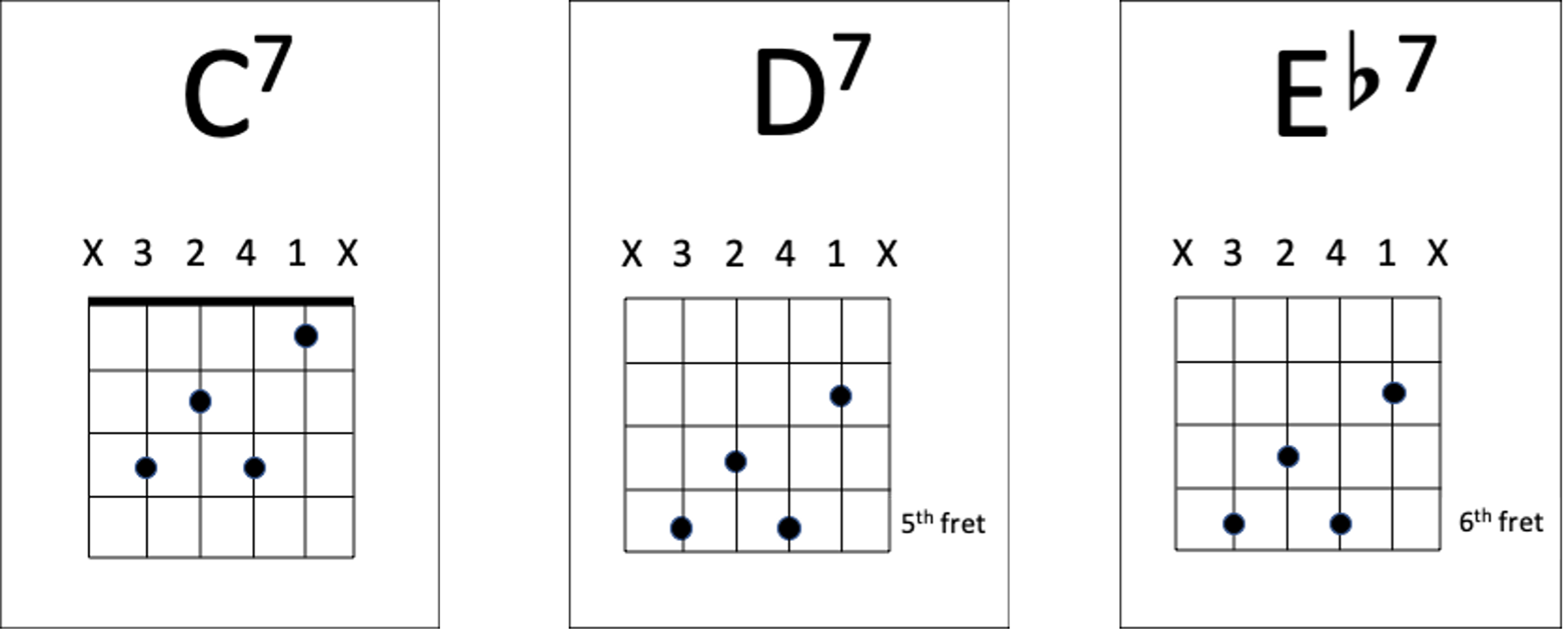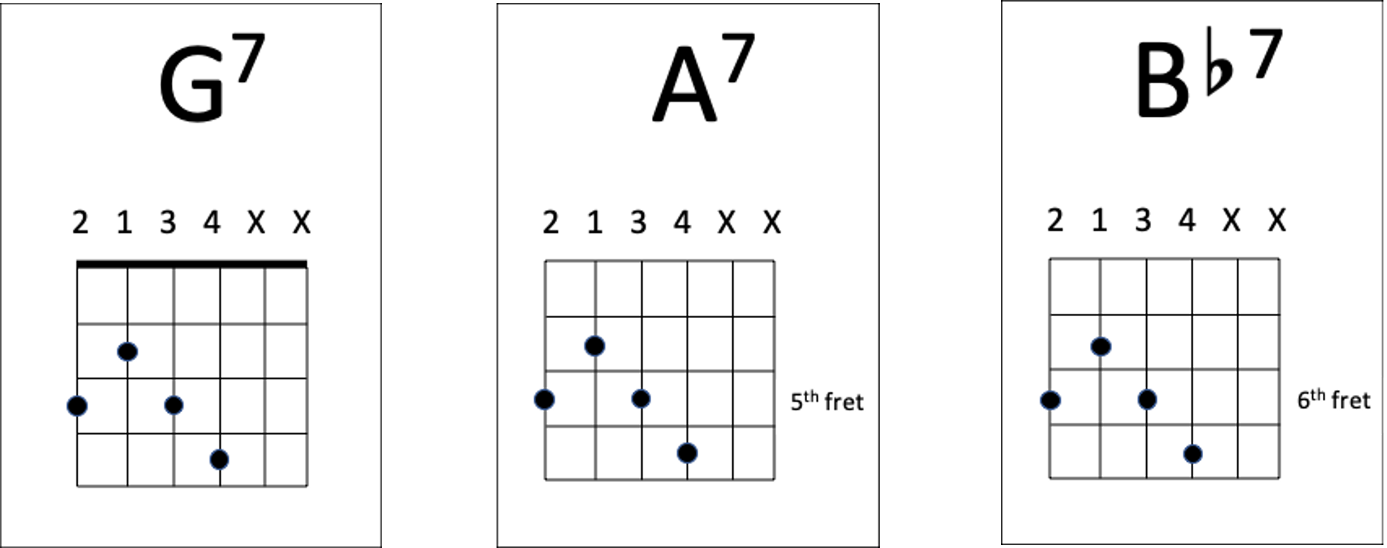A similar concept based on G7. This fingering for G7 is not the typical fingering for G7, as the first two strings are muted. This fingering has been chosen as the chord shape does not include open strings and can therefore be moved up and down the fretboard. Moving the chord shape up two frets forms A7 and an additional fret to form Bb7.