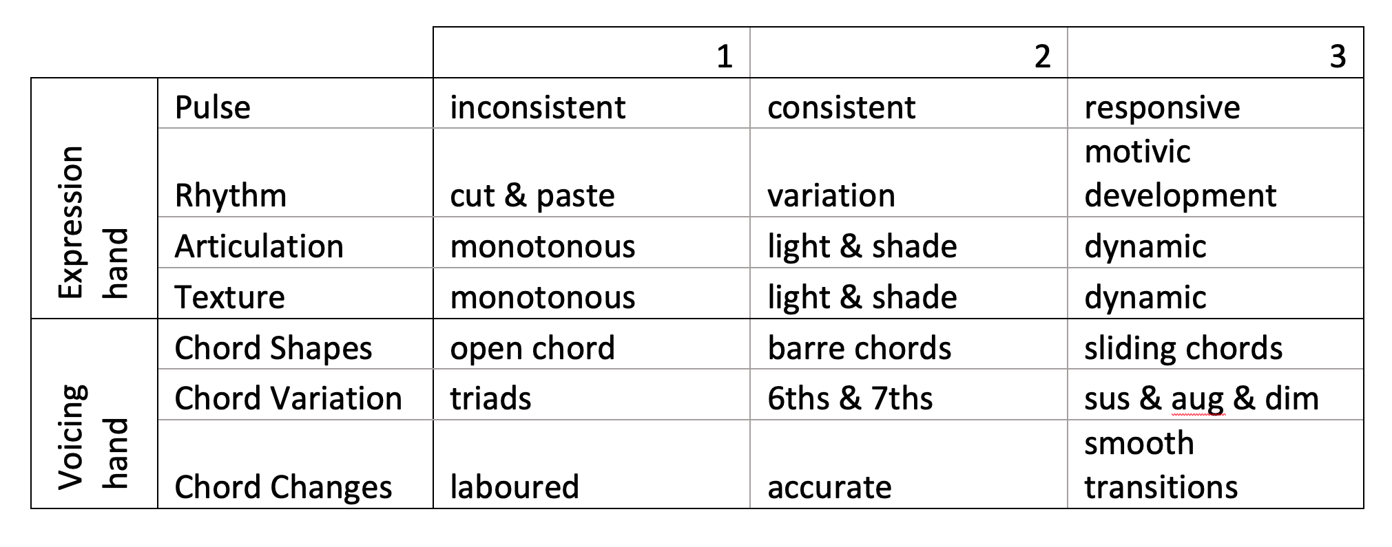 Seven skills (four in the expression hand and three in the voicing hand) are rated out of three for a maximum total score out of 21. A score of one indicates the skill is not yet fully established. Two indicates the skill is at a functional level and three indicates an advanced level where the participant can manipulate that component skill flexibly to respond to the musical stimuli and guide the musical and therapeutic direction.